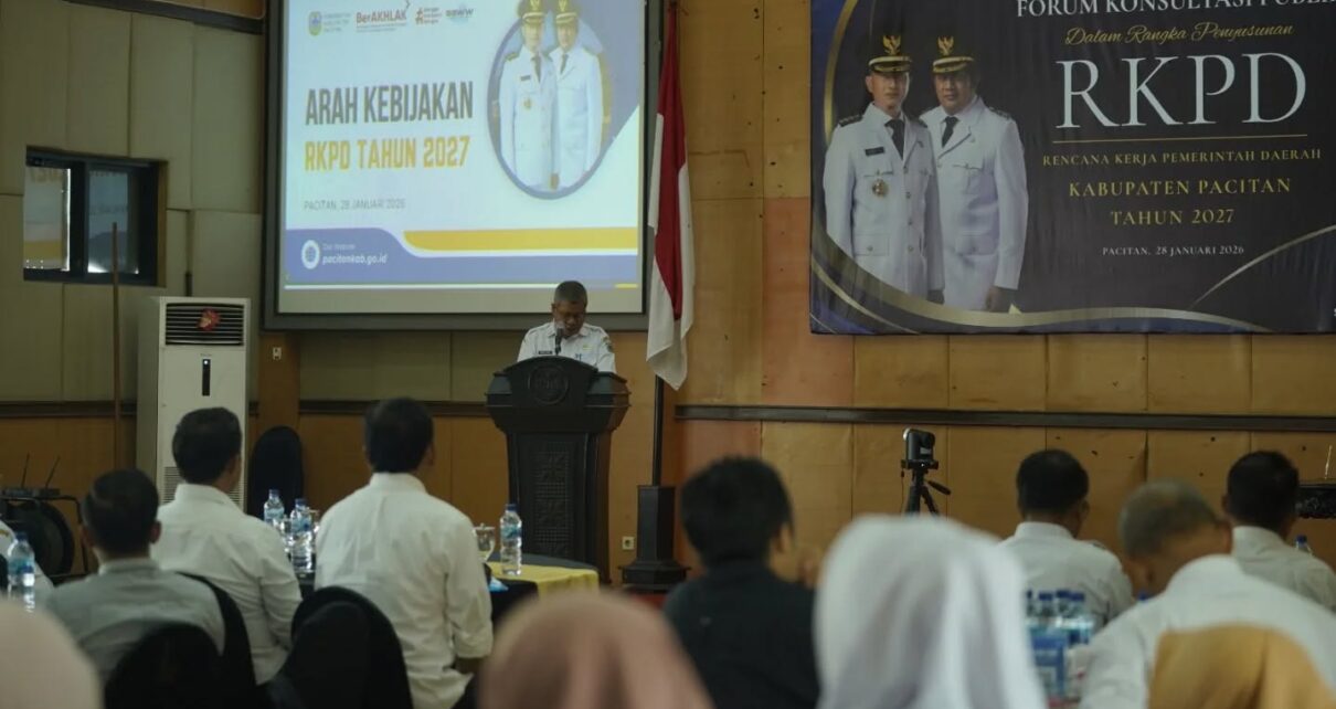 PACITAN – Sekretaris Daerah Kabupaten Pacitan Heru Wiwoho membuka Forum Konsultasi Publik Rencana Kerja Pemerintah Daerah (RKPD) Kabupaten Pacitan Tahun 2027 yang digelar di Gedung Karya Darma, Rabu (28/01). Kegiatan tersebut menjadi tahapan strategis dalam proses perencanaan pembangunan daerah guna mewujudkan visi dan misi Kabupaten Pacitan.